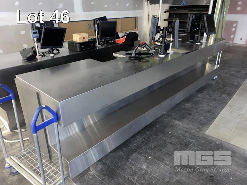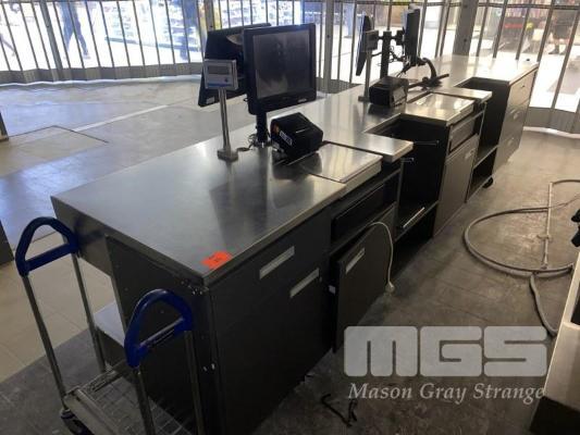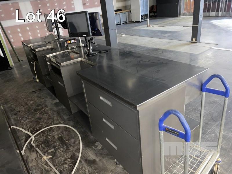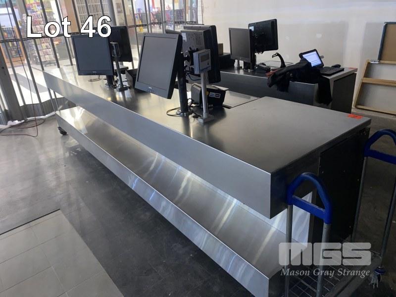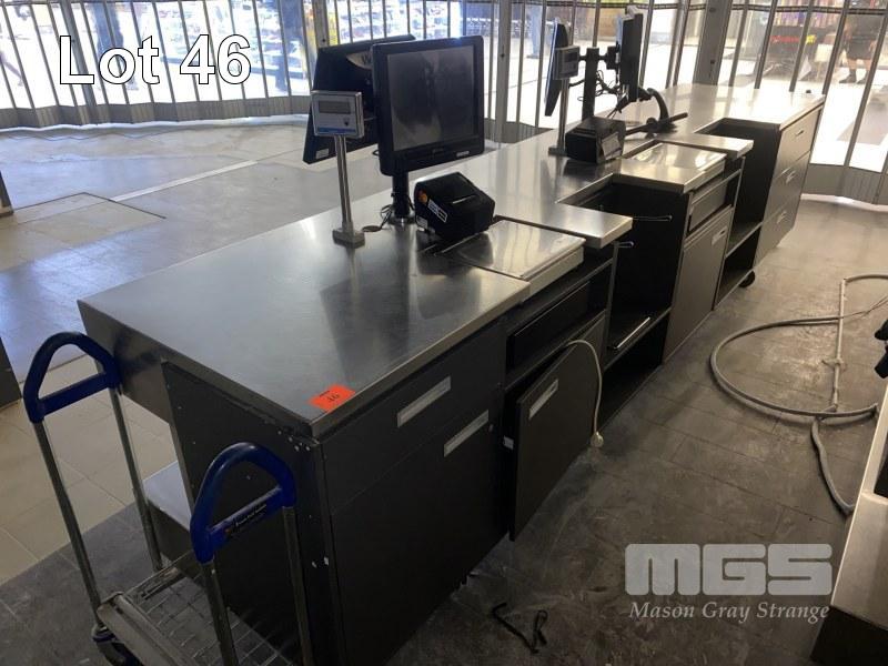 COMPLETE POS/CASHIERS STATION 3000 x 800mm COMPRISING: 2 x POS TOUCH SCREEN REGISTERS, 2 x CUSTOMERS DISPLAY MONITORS, 2 x TERAOKA DIGITAL SCALES MODEL: DS-866, 15kg, 2 x DOCKET PRINTERS, 2 x CASH DRAWERS, CUSTOM BUILT PC CELERON 1.5ghz, 1GB RAM
