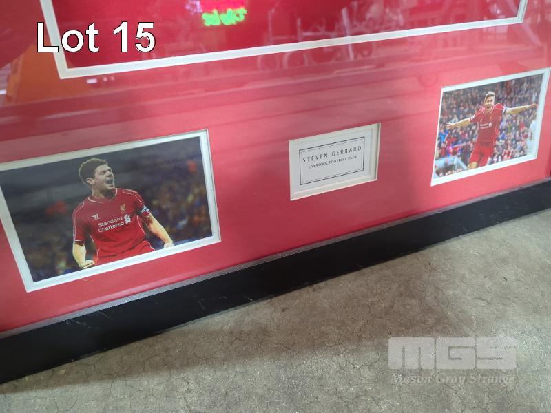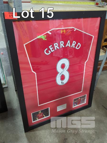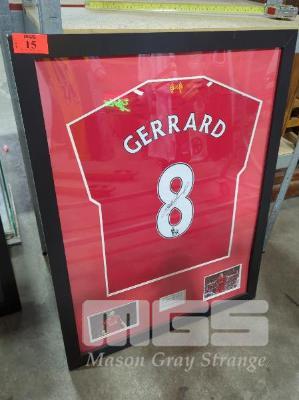 FRAMED AND GLAZED FANWEAR SOCCER TOP. NUMBER 8, STEVEN GERRARD, LIVERPOOL FOOTBALL CLUB. (0.67 X 0.88 M W H)