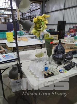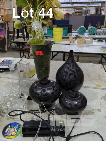 ASSORTED HOMEWARES ETC. INCLUDES 3-HEAD FLOOR LAMP, GLASS VASES, TUMBLERS & OTHER GLASSWARE, LARGE METALLIC VASE & IMITATION FLOWERS, LARGE CERAMIC PATTERNED VASE & JARS, X-BOX GAME CONSOLE SENSOR ETC.