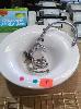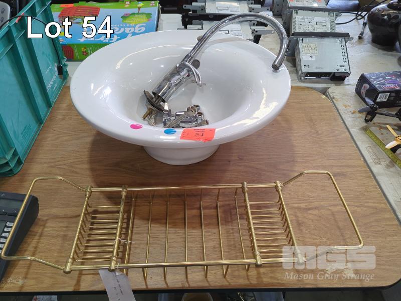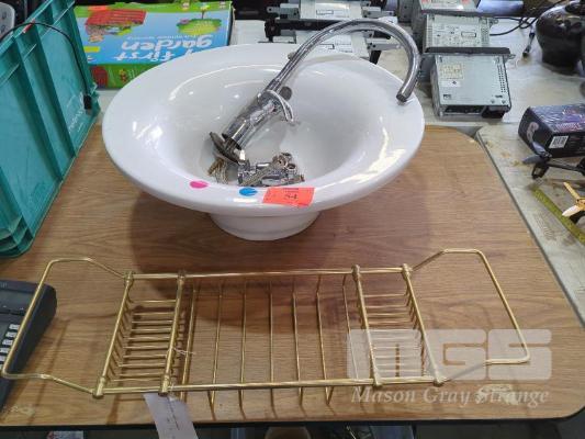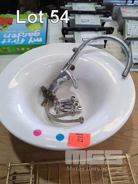 LARGE CERAMIC BASIN (57 CM DIAMETER), TAP SET, LONG SPOUT MIXER TAP AND BRASS BATH BASKET.