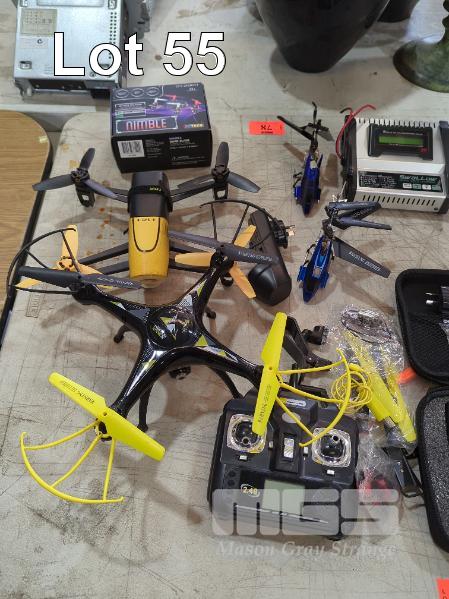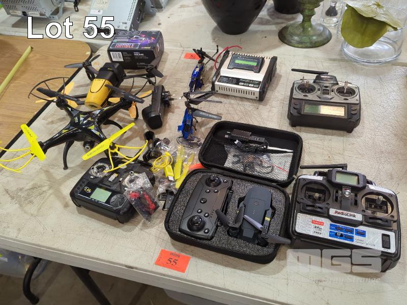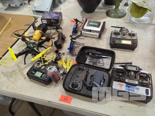 ASSORTED REMOTE CONTROL DRONES, LCD CONTROLLERS , CHARGERS ETC