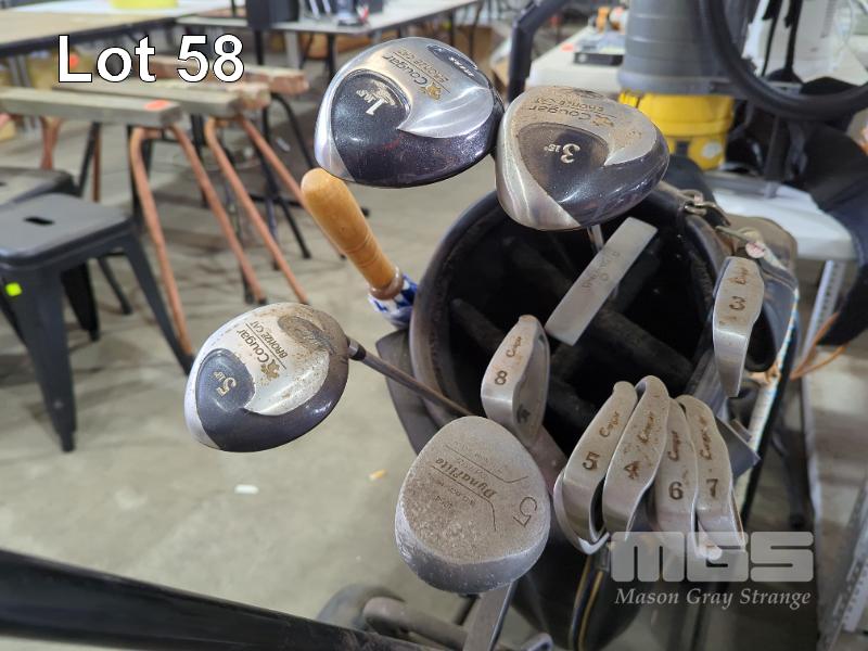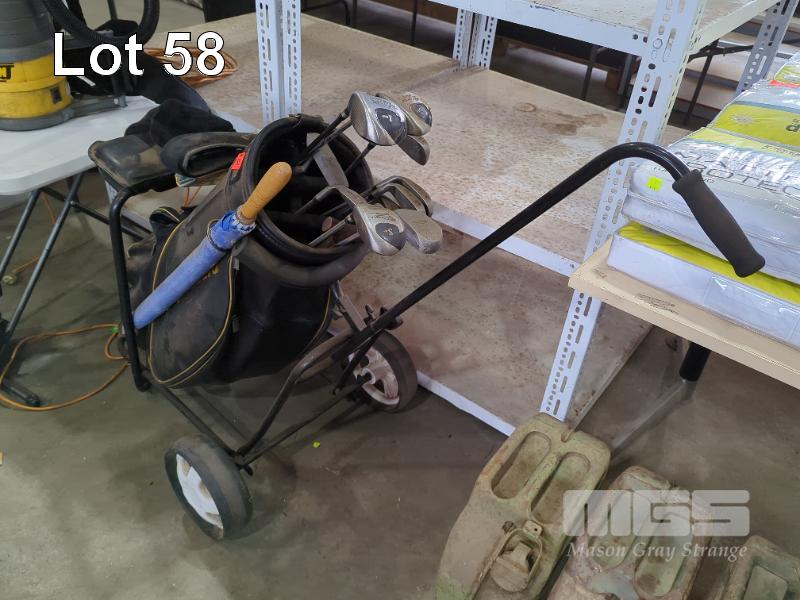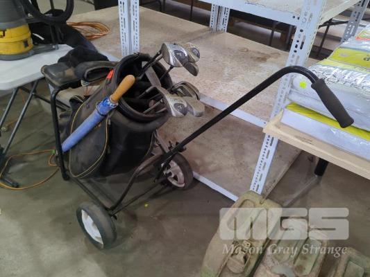 SET OF GOLF CLUBS, GOLF BAG, UMBRELLA AND CART.
