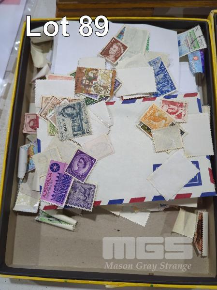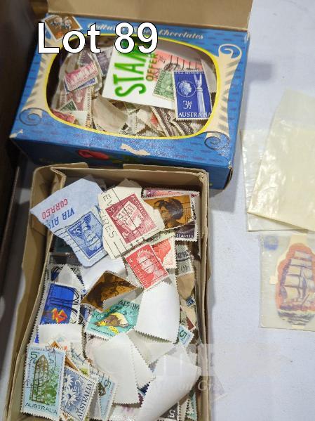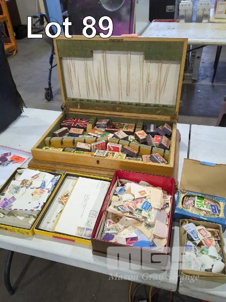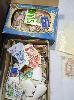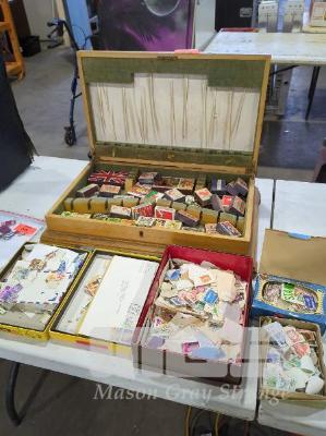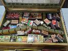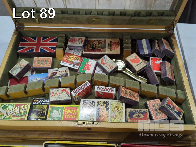 COLLECTION OF OLD MATCHBOXES, STAMPS, WOODEN CUTLERY BOX, WATCH ETC.