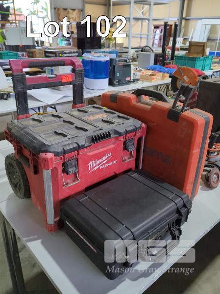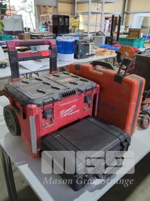 MILWAUKEE PACKOUT ROLLING TOOLBOX. PELICAN CASE AND HUSQVARNA CASE (ALL EMPTY)