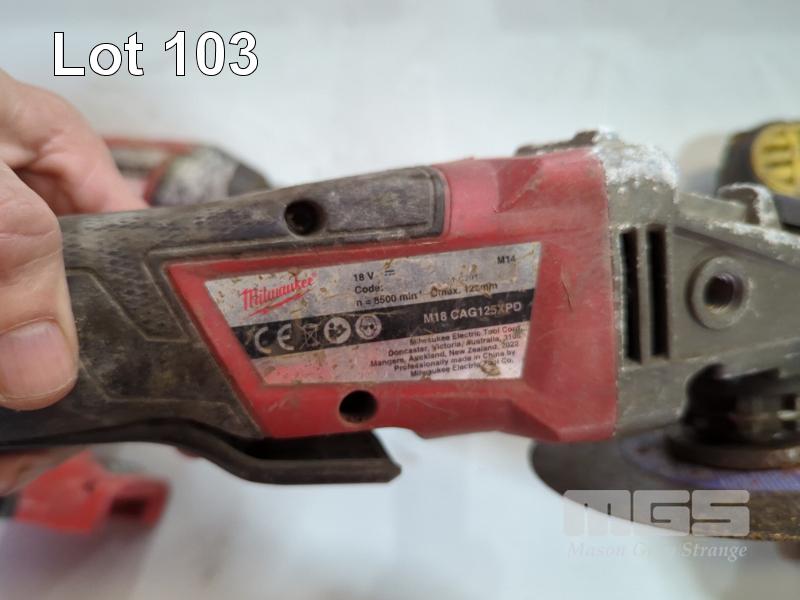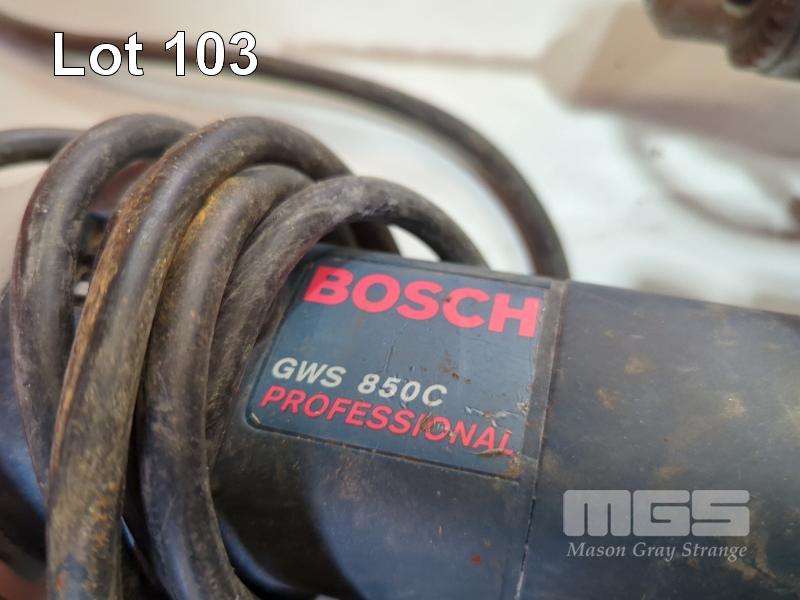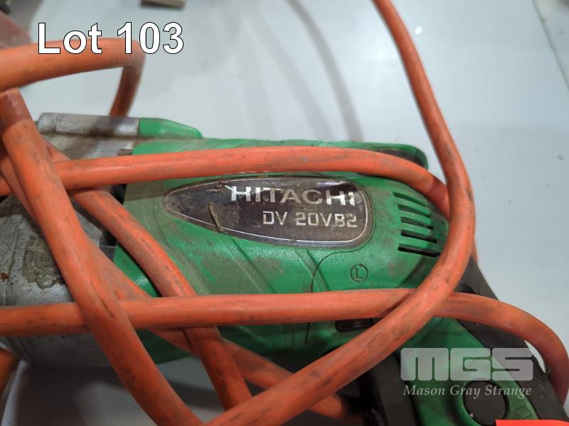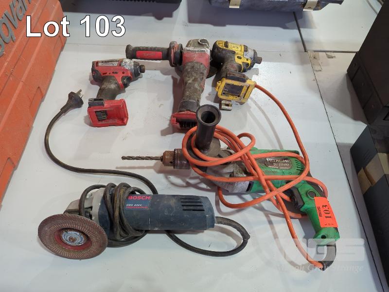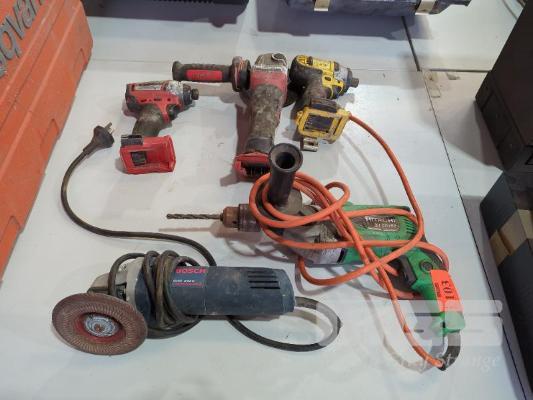 ASSORTED POWER TOOLS. HITACHI 240V HAMMER DRILL DV 20V2, BOSCH 240V ANGLE GRINDER GWS 850C, MILWAUKEE CORDLESS ANGLE GRINDER & DRIVER AND DEWALT CORDLESS DRIVER ** NO BATTERIES **