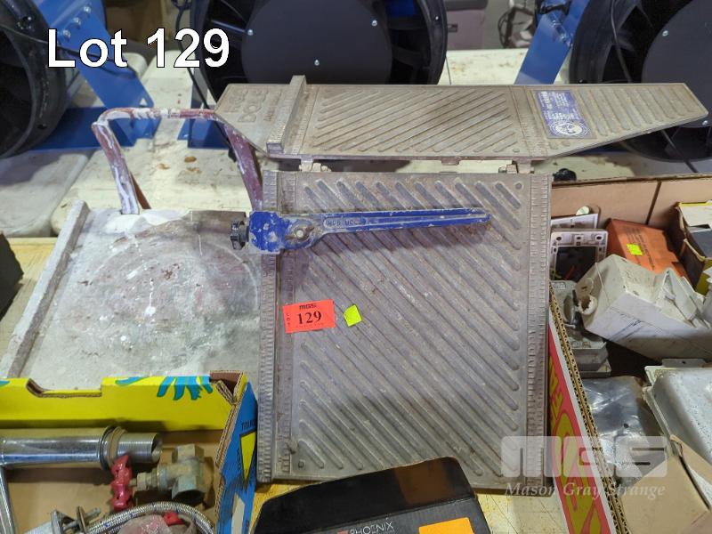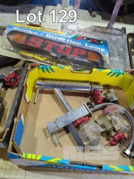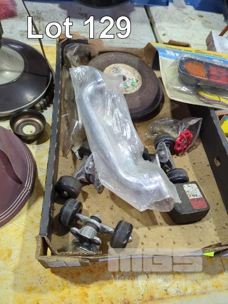 GRINDING DISCS, VINTAGE ARC DECO FLOOR LAMP, SKATEBOARD TRUCKS, TAPWARE, VALVES, BRAKE & DIRECTION LAMP, ROB DOLS TILE CUTTING TABLE & ASSORTED ELECTRICAL SWITCHES, JUNCTION BOXES ETC.