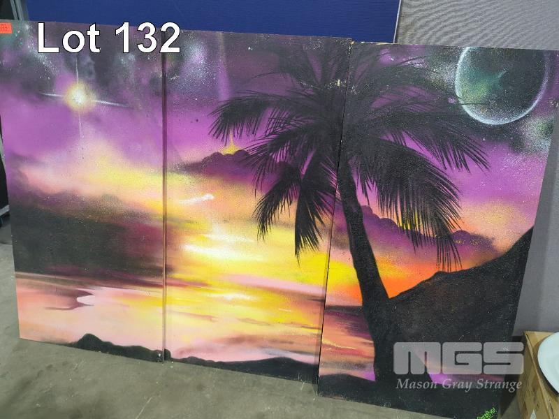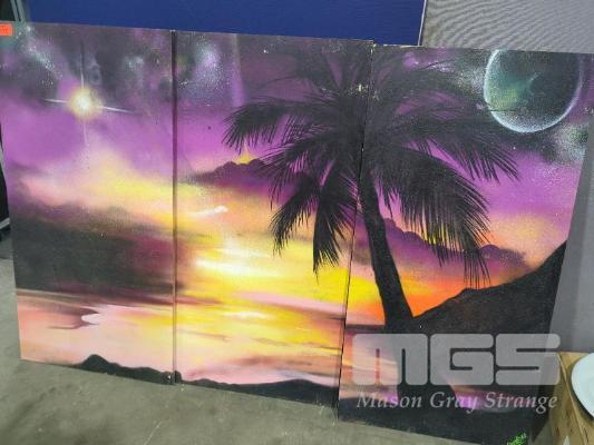 ORIGINAL ARTWORK. NOSTALGIC AIRBRUSHED ISLAND. 3 X PANELS (61 X 121 CM W H EACH)
