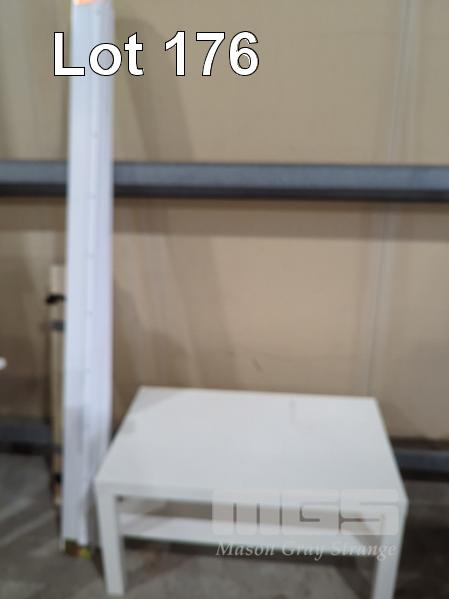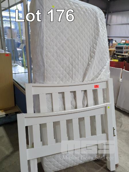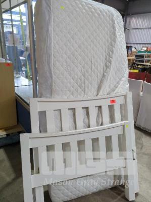 CONTEMPORARY WHITE PAINTED SINGLE BED FRAME AND MATTRESS. GLOSS WHITE CONTEMPORARY MAGAZINE TABLE.