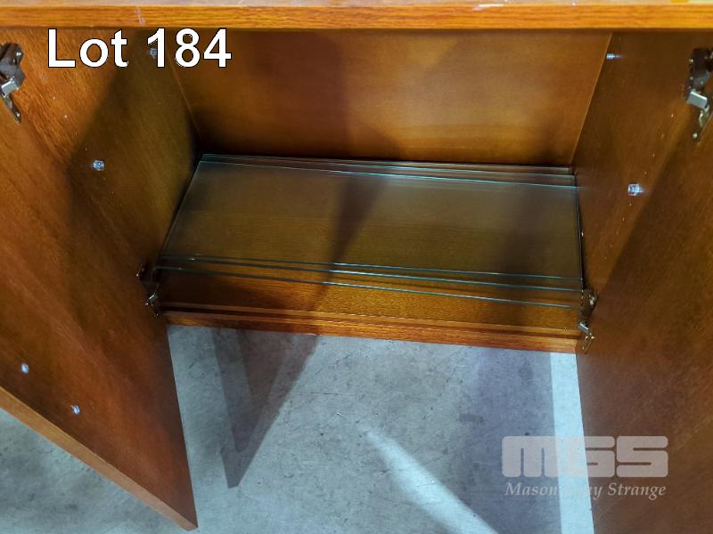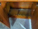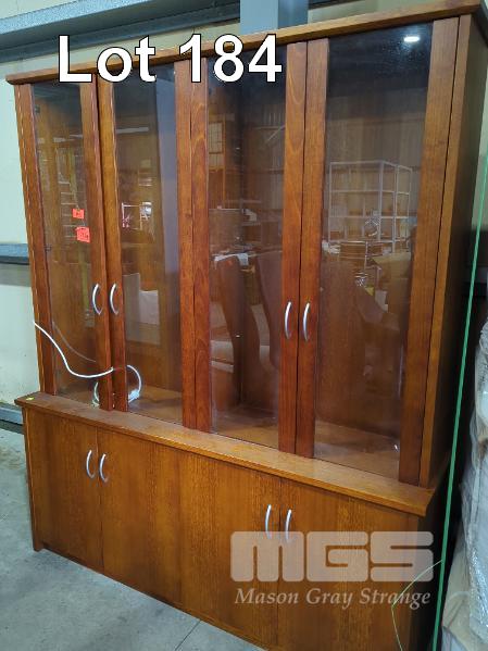 2-SECTION ILLUMINATED OAK DISPLAY CABINET, 2 X GLASS SHELVES EACH SECTION. 4-DOOR, SINGLE SHELF UNDER STORAGE.