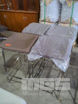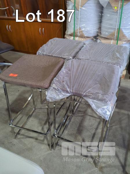 4 X PADDED BAR STOOLS, FABRIC CUSHION IN MEDIUM BROWN, CHROME STEEL FRAME.