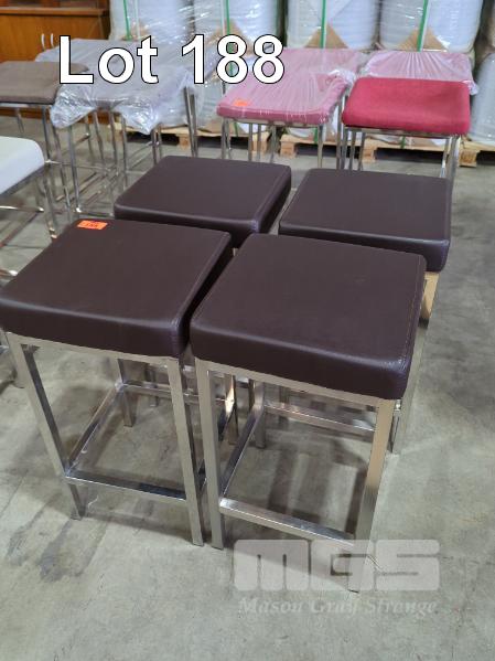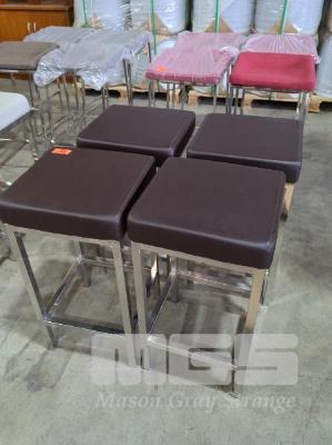 4 X PADDED BAR STOOLS, DARK BROWN CUSHION, CHROME STEEL FRAME.