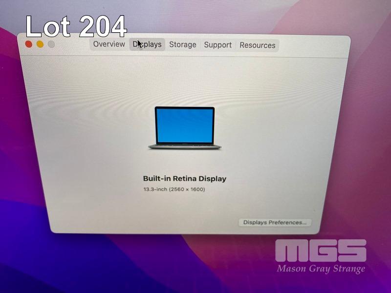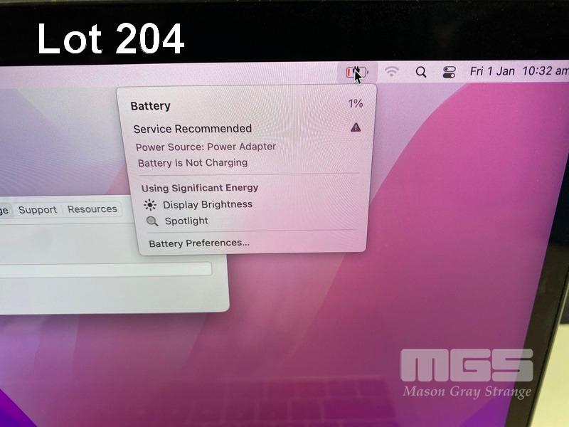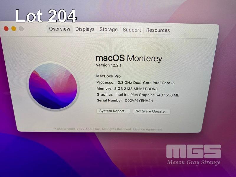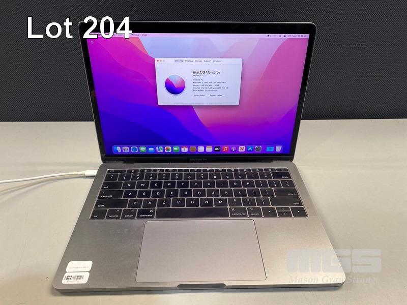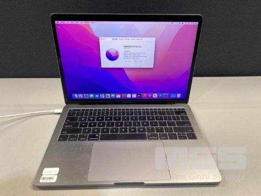 LAPTOP, APPLE MACBOOK PRO (A1708), CORE i5 7360U (7TH GEN) @ 2.3GHz, 8GB DDR3 RAM, 512GB SSD, 13.3" RETINA DISPLAY (2560x1600), INTEL IRIS PLUS GRAPHICS 640, THUNDERBOLT 3, Wi-Fi, BLUETOOTH, MAC OS 12 INSTALLED (NO USB-C POWER SUPPLY) (NOTE: MESSAGE "BATTERY SERVICE RECOMMENDED", BATTERY NOT CHARGING, MINOR MARKS ON SCREEN) S/N:C02VP1YEHV2H