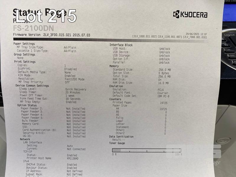 PRINTER, KYOCERA FS-2100DN LASER, USB, NETWORK, 19,725 PAGES (TEST PAGE ATTACHED) S/N:LQB5603719