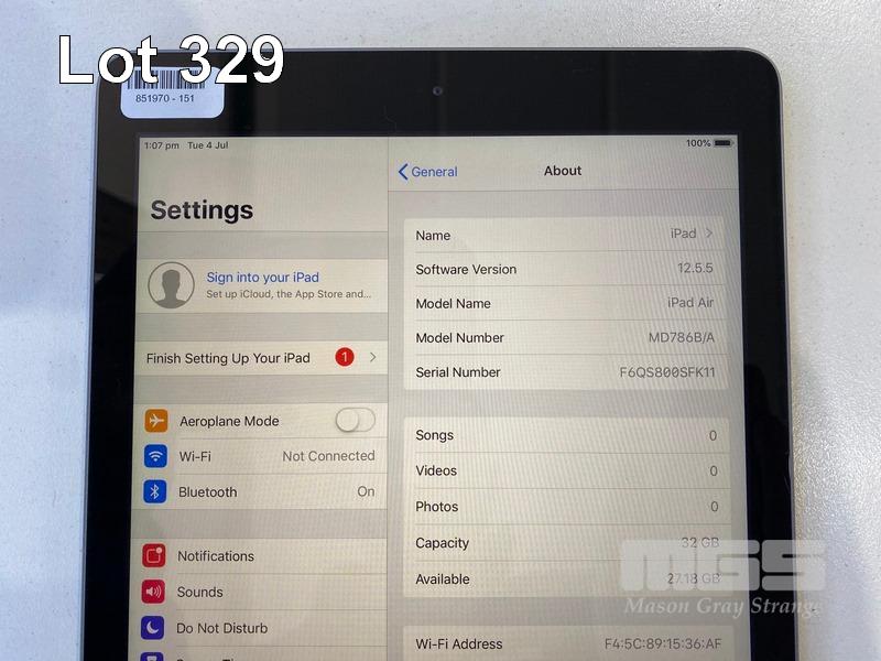 APPLE iPAD AIR, 32GB, Wi-Fi, SPACE GREY, MODEL A1474, MD786B/A (NO CABLE, NO CHARGER) S/N:F6QS800SFK11
