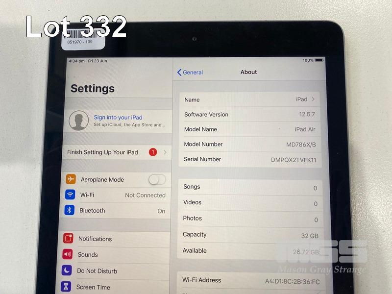 APPLE iPAD AIR, 32GB, Wi-Fi, SPACE GREY, MODEL A1474, MD786X/B (NO CABLE, NO CHARGER) S/N:DMPQX2TVFK11