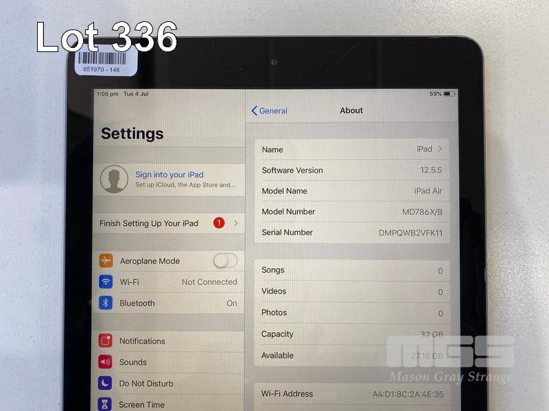 APPLE iPAD AIR, 32GB, Wi-Fi, SPACE GREY, MODEL A1474, MD786X/B (NO CABLE, NO CHARGER) S/N:DMPQWB2VFK11