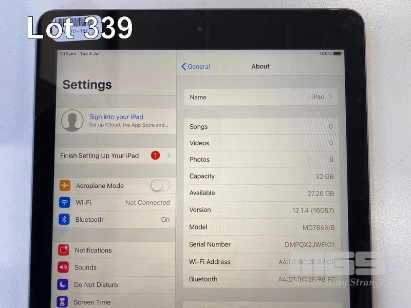 APPLE iPAD AIR, 32GB, Wi-Fi, SPACE GREY, MODEL A1474, MD786X/B (NO CABLE, NO CHARGER) S/N:DMPQX2JWFK11