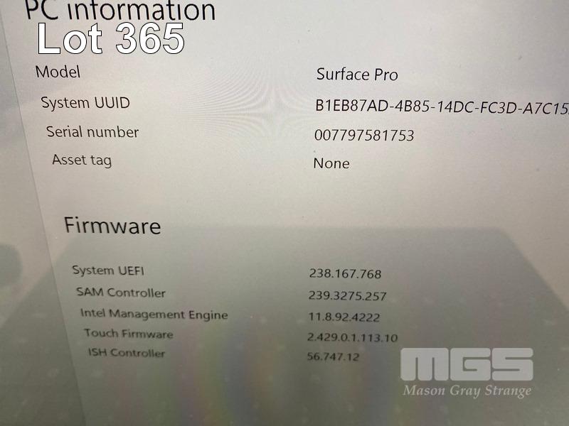 TABLET PC, MICROSOFT SURFACE PRO 5TH GEN, MODEL 1807, CORE i5 7300U (7TH GEN) @ 2.6GHz, 8GB RAM, 256GB SSD, 12.3" TOUCHSCREEN (2736x1824), INTEL HD GRAPHICS 620, Wi-Fi, CELLULAR, BLUETOOTH, WINDOWS 10 PRO INSTALLED, KEYBOARD TYPE COVER & POWER SUPPLY (NOTE: SMALL WHITE SPOT SCREEN BLEMISH) S/N:00797581753