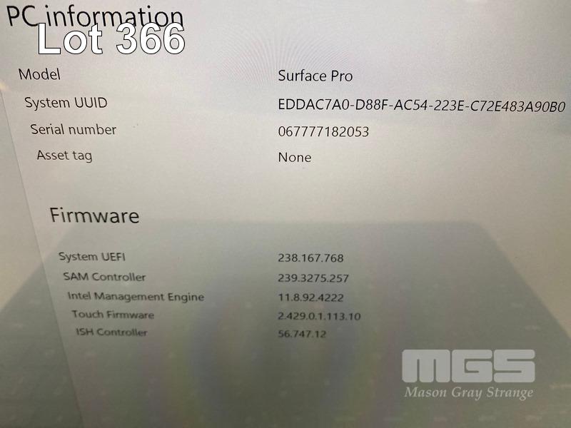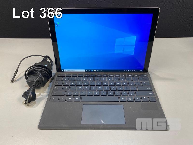 TABLET PC, MICROSOFT SURFACE PRO 5TH GEN, MODEL 1807, CORE i5 7300U (7TH GEN) @ 2.6GHz, 8GB RAM, 256GB SSD, 12.3" TOUCHSCREEN (2736x1824), INTEL HD GRAPHICS 620, Wi-Fi, CELLULAR, BLUETOOTH, WINDOWS 10 PRO INSTALLED, KEYBOARD TYPE COVER & POWER SUPPLY (NOTE: SMALL WHITE SPOT SCREEN BLEMISH, DAMAGE TO KEYBOARD TYPE COVER) S/N:067777182053