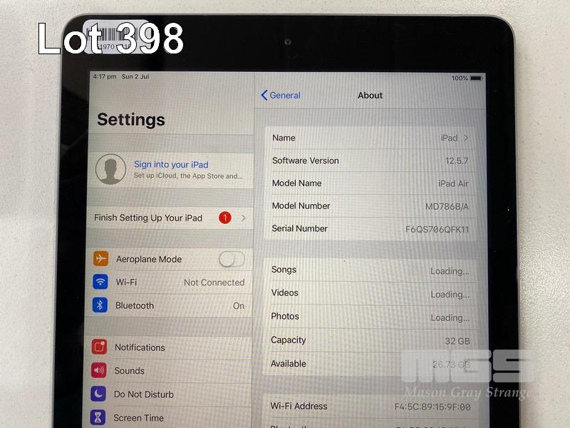 APPLE iPAD AIR, 32GB, Wi-Fi, SPACE GREY, MODEL A1474, MD786X/B (NO CABLE, NO CHARGER) S/N:F6QS706QFK11