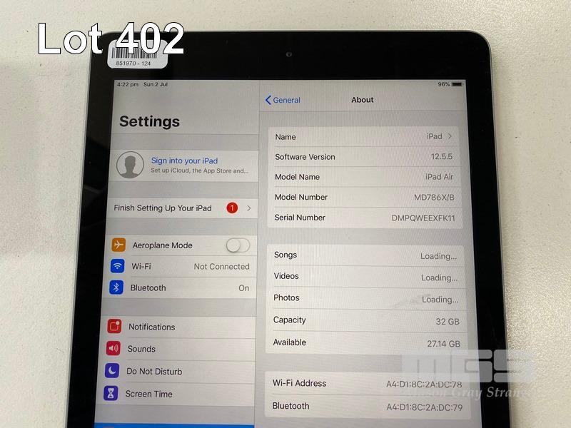 APPLE iPAD AIR, 32GB, Wi-Fi, SPACE GREY, MODEL A1474, MD786X/B (NO CABLE, NO CHARGER) S/N:DMPQWEEXFK11