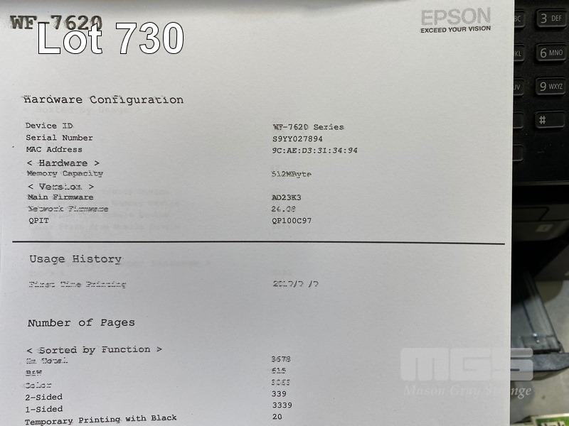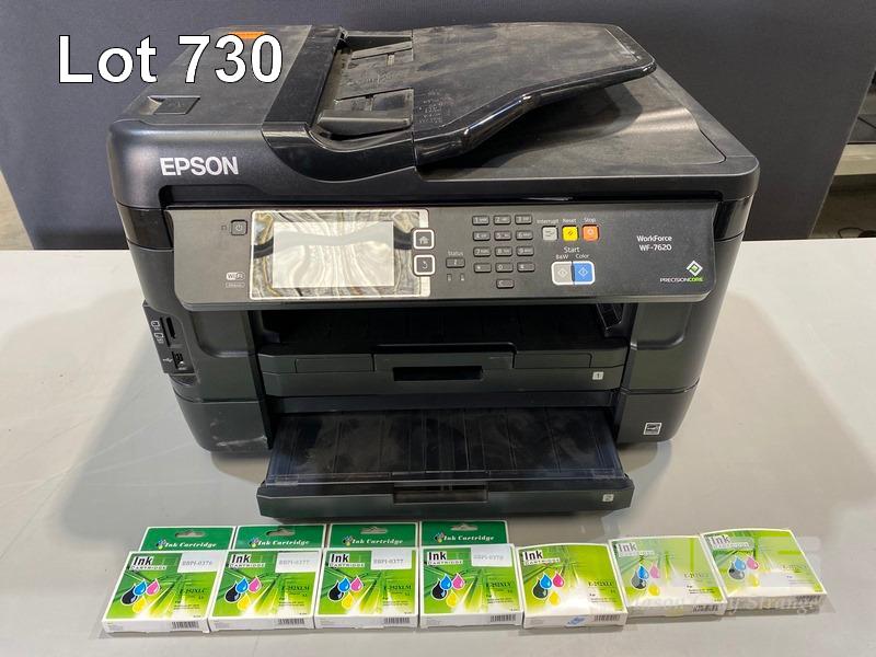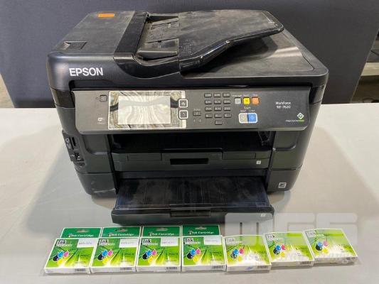 PRINTER, EPSON WORKFORCE WF-7620 MFC INKJET (TEST PAGE ATTACHED - POOR QUALITY) WITH SPARE INK CARTRIDGES (EXPIRED) S/N:S9YY027894