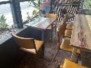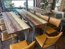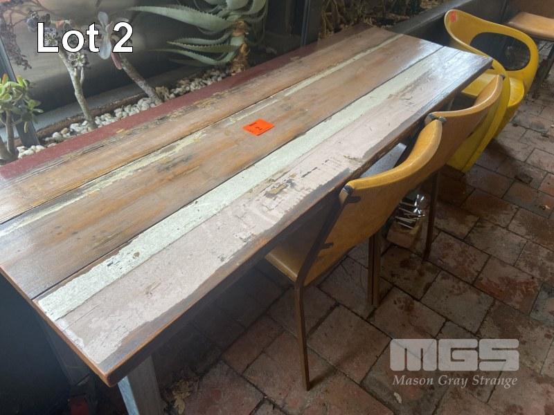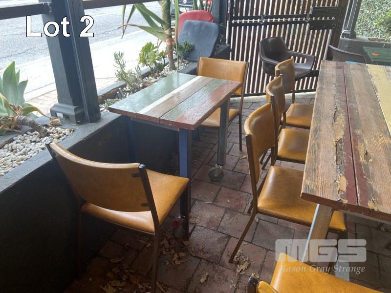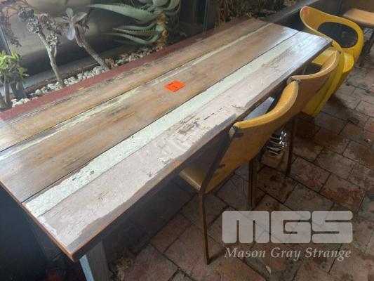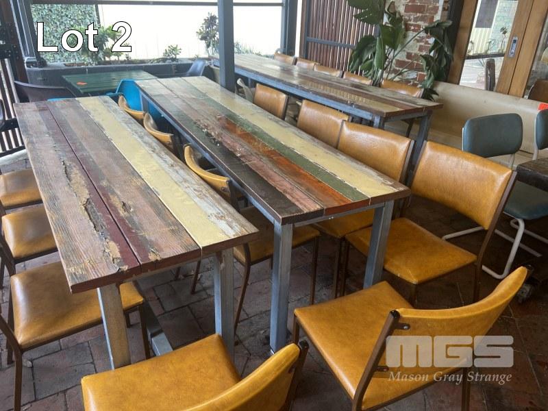 5 x PLANK TIMBER TABLES INCLUDING 1 @ 750 x 520mm 1 @ 1580 x 520mm 1 @ 1900 x 520mm 1 @ 2350 X 520mm & 1 @ 2600 x 520mm, MOBILE & 20 x MATCHING VINYL, STEEL FRAME CHAIRS