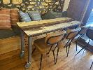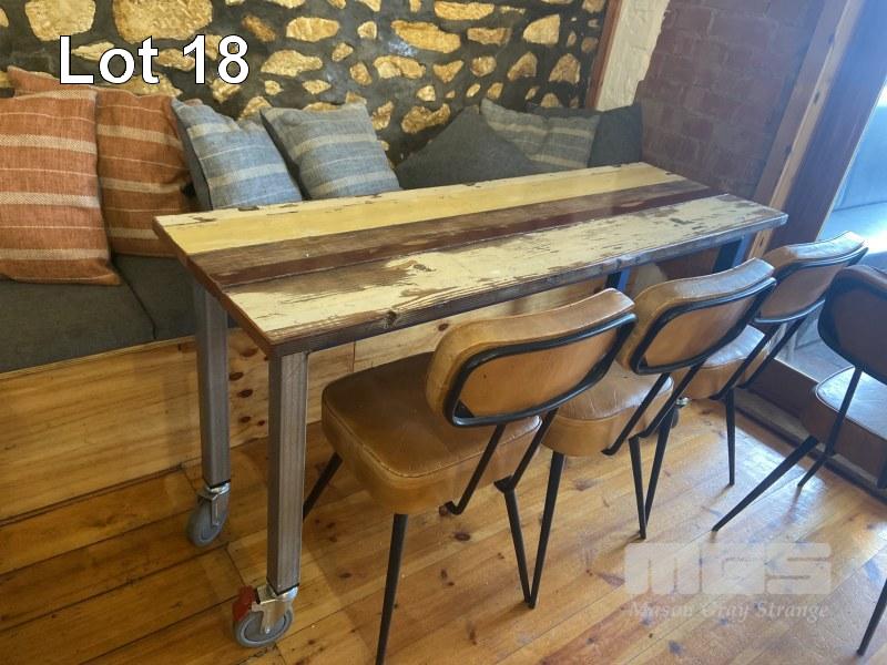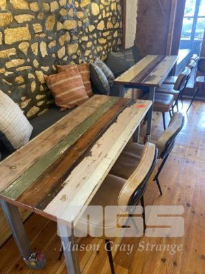 2 x MATCHING PLANK TIMBER TABLES, MOBILE, 1300 X 560Mm & 1580 x 560mm & 6 x MATCHING BROWN VINYL CHAIRS WITH 11 x CUSHIONS
