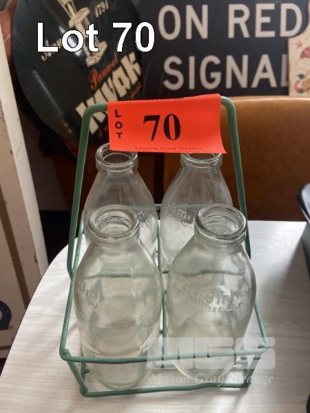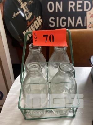 4 x EARLY GLASS MILK BOTTLES & CARRY CRADLE