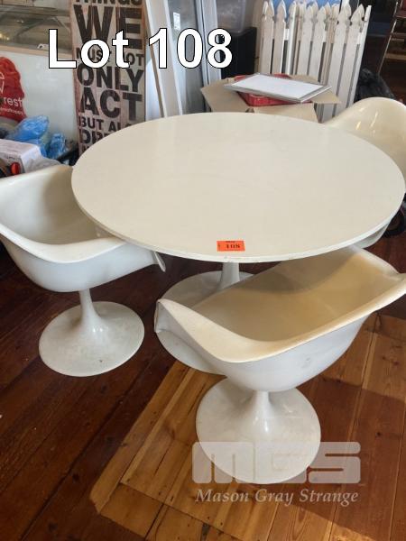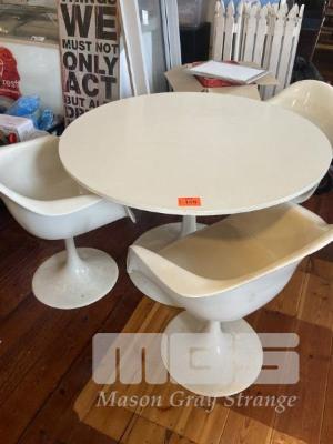 ROUND TIMBER TABLE, 1080mm DIAMETER, WHITE & 4 x PLASTIC CHAIRS