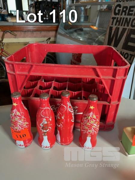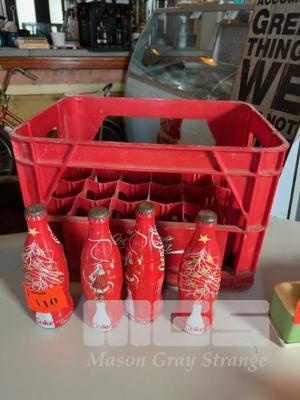 4 x COLLECTABLE COKE BOTTLES WITH COKE CRATE