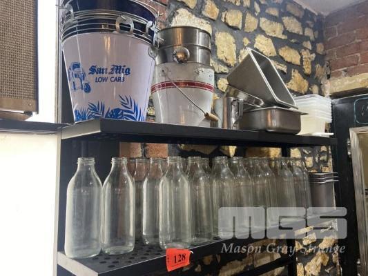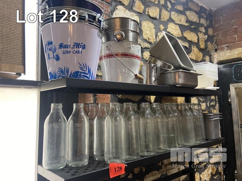 27 x GLASS WATER BOTTLES, STAINLESS STEEL TRAYS, PLASTIC TRAYS, STAINLESS STEEL BUCKETS, ICECREAM SCOOPS, CONTENTS STORAGE RACK