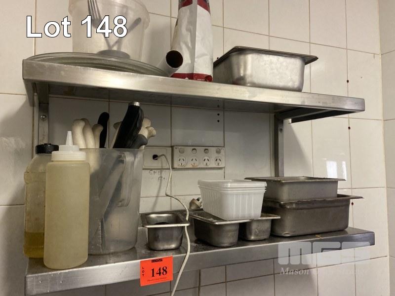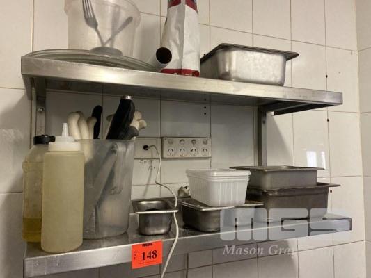 WALL SHELF UNIT, STAINLESS STEEL, 900 x 330mm, 2 TIER WITH STAINLESS STEEL TRAYS & CONTENTS