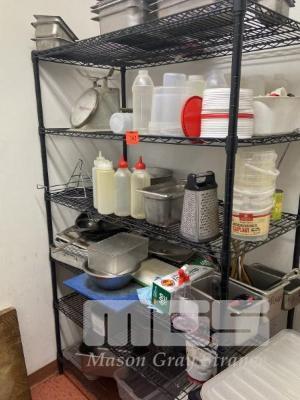RACK & CONTENTS STAINLESS STEEL TRAYS, ALUMINIUM TRAYS, SCALES, TUBS, GRATER, ETC