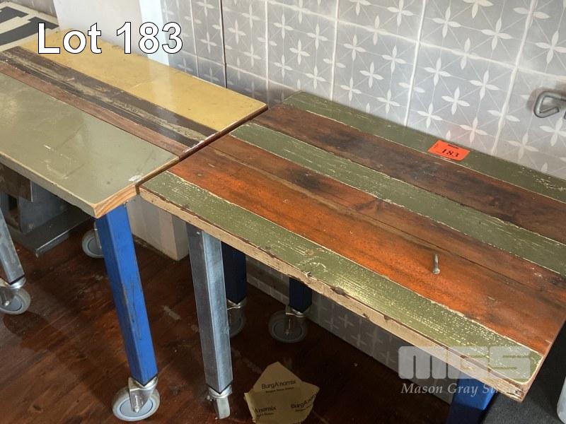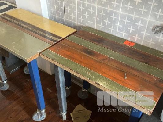 PAIR SMALL TIMBER PLANK MOBILE TABLES, 800 x 400mm APPROX
