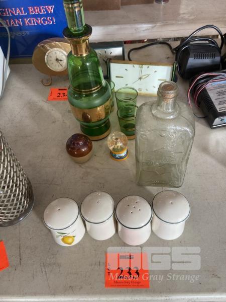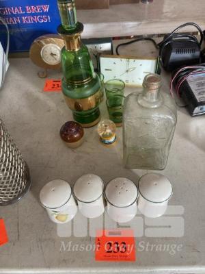 4 x PORCELAIN SALT & PEPPER SHAKERS HALLS BOTTLE, DECANTER & 3 x GLASSES