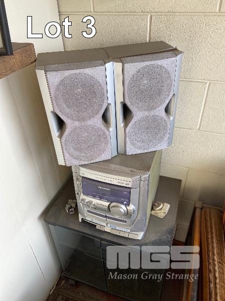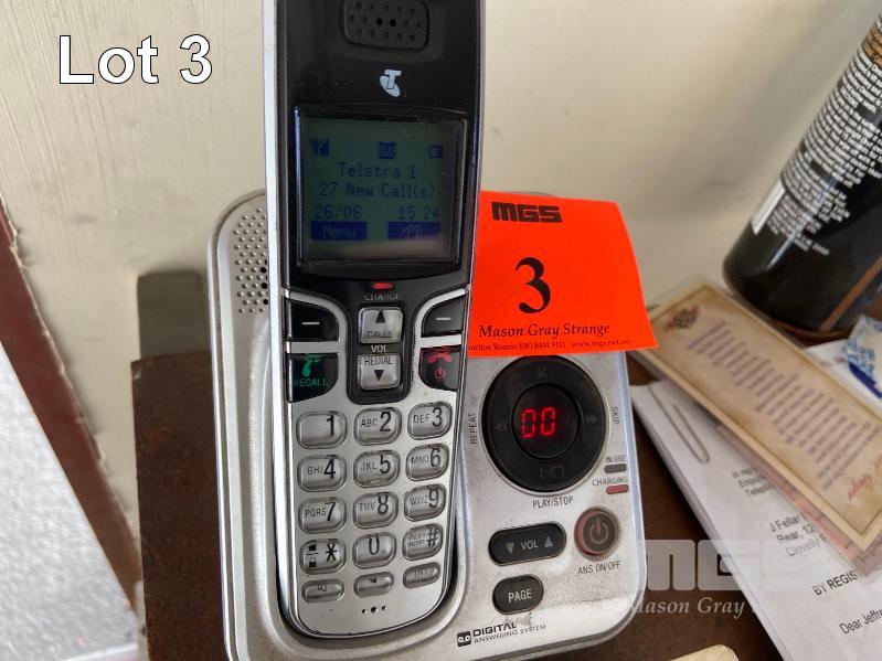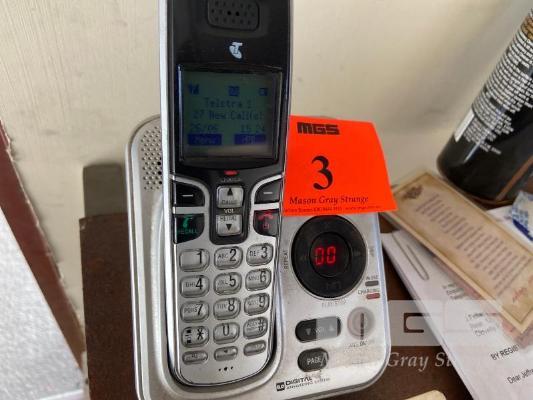 CORDLESS PHONE & BASE, TELSTRA, SANYO DISC/RADIO PLAYER ON STAND