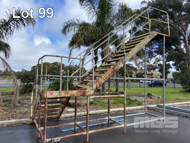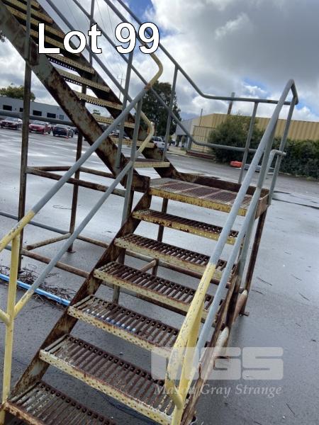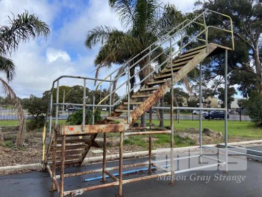 STEEL STAIR SET HEIGHT TO PLATFORM: 3.4m 2.5m (W) 4.3m (L) WITH HAND RAILS, GALV
