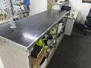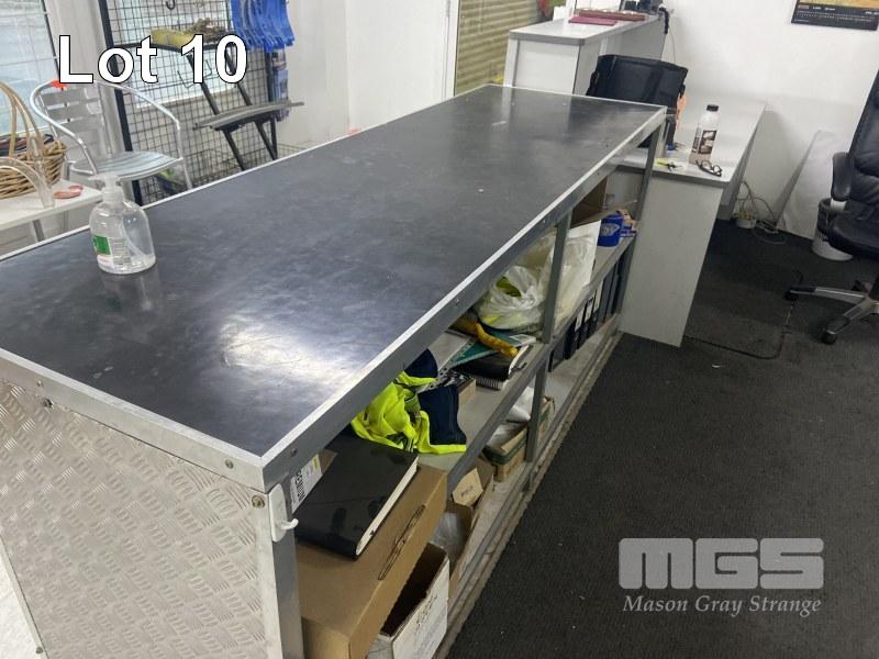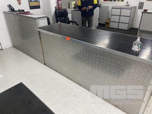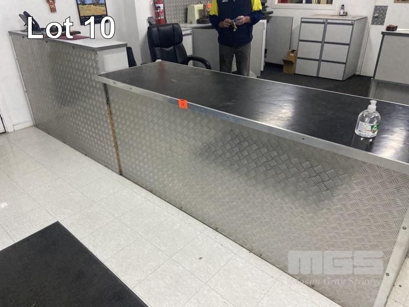 RECEPTION COUNTER/DESK, 1800mm (L), GREY MELAMINE WITH HUTCH & PARTS DELIVERY BENCH, 2220 (L) x 700 (W) x 950mm (H) WITH ALUMINIUM CHECKER PLATE, OFFICE CHAIR, 3 DRAWER MATCHING FILING CABINET & 3 DOOR SIDE CUPBOARD