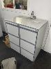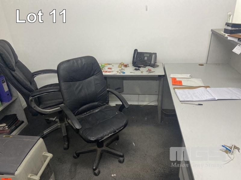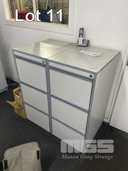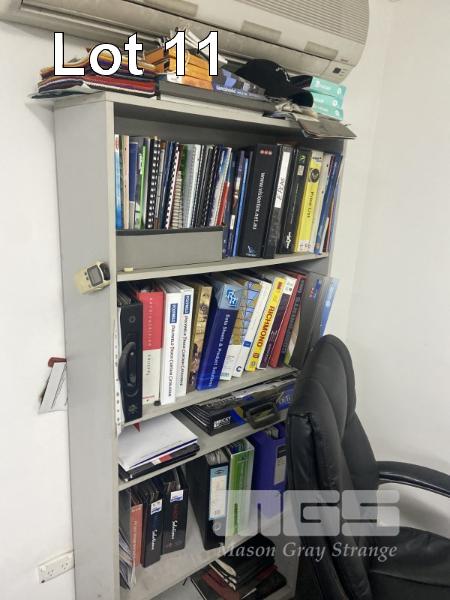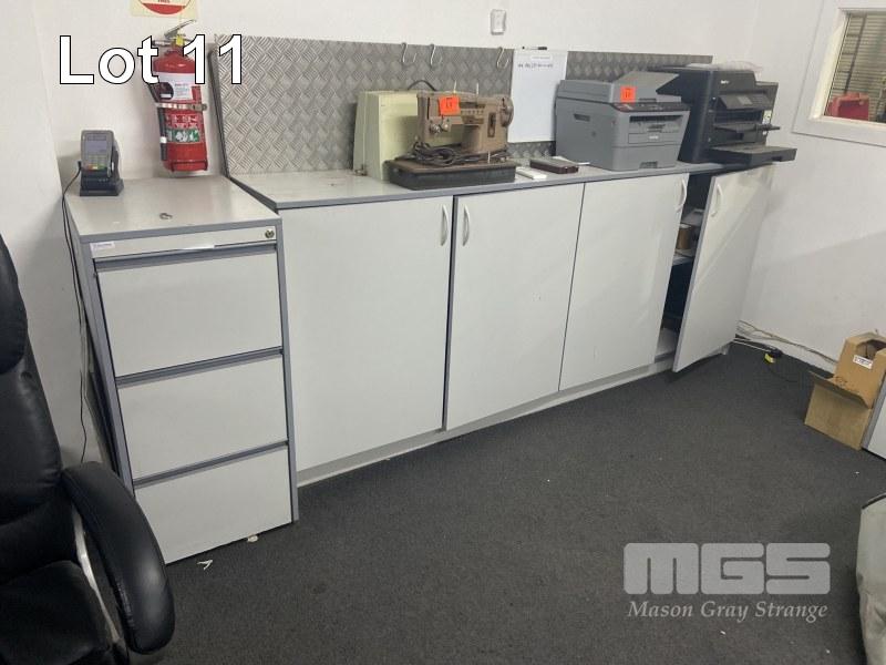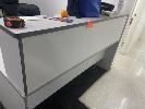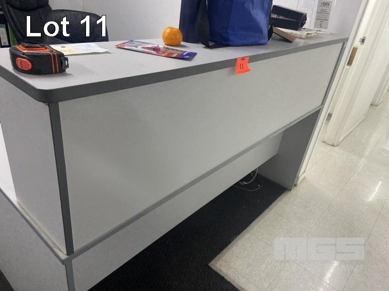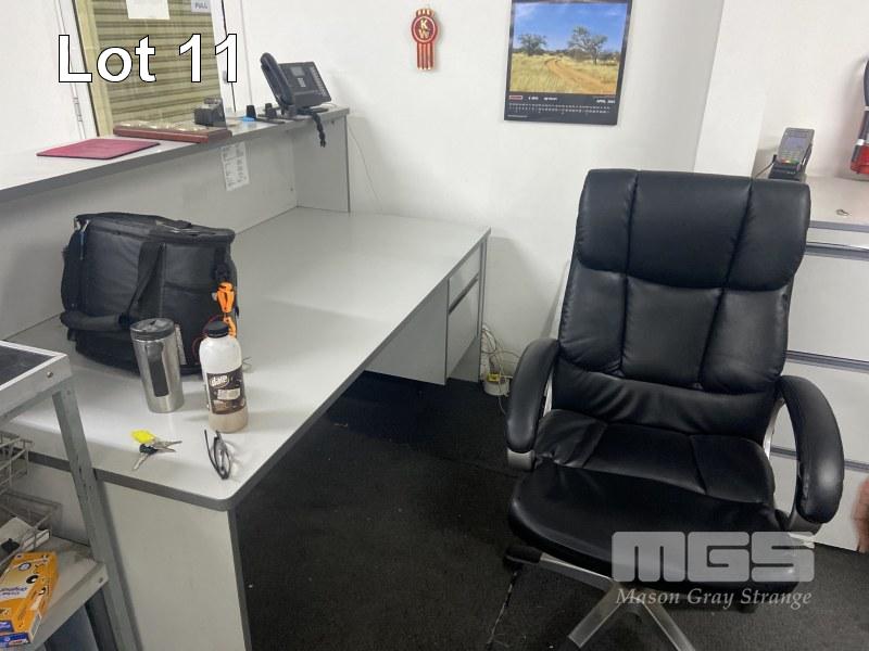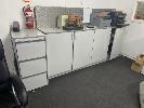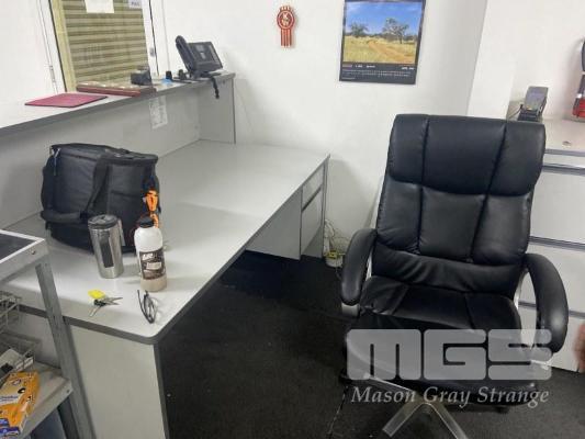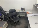 RECEPTION DESK & RETURN, 1800mm (L), GREY MELAMINE, BOOKSHELF, 6 TIER, 1800mm, 2 x CHAIRS & 2 x 3 DRAWER MATCHING FILING CABINETS