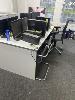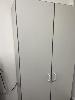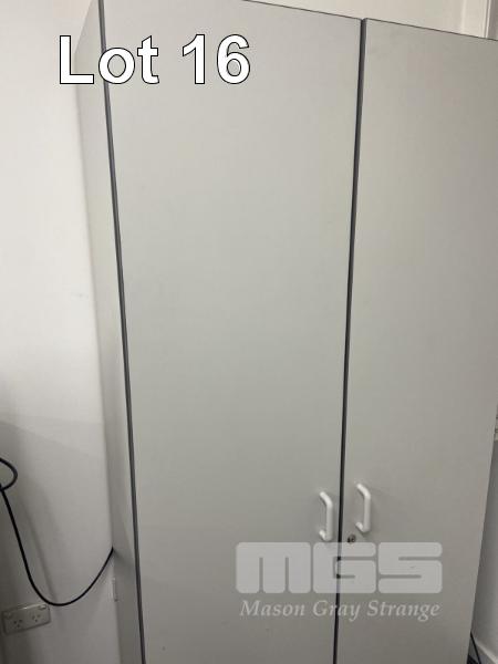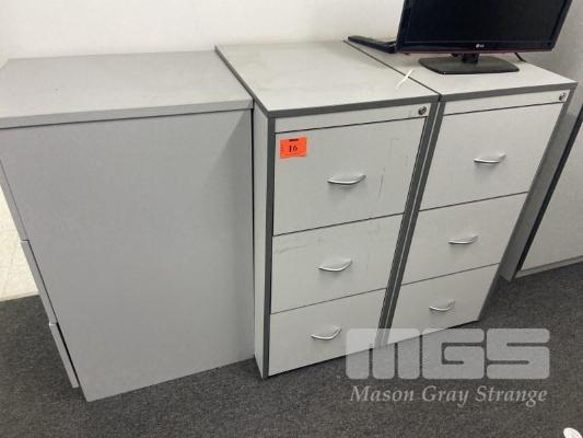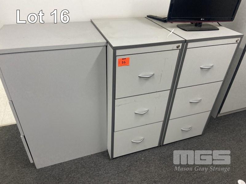 3 x 3 DRAWER FILING CABINETS, GREY MELAMINE, 2 DOOR STOCK CUPBOARD, MEETING TABLE & 2 x CHAIRS