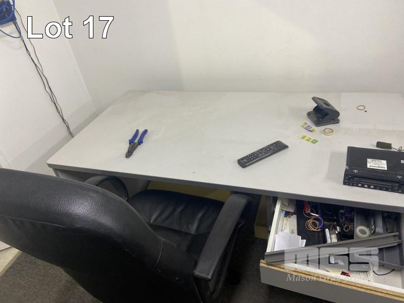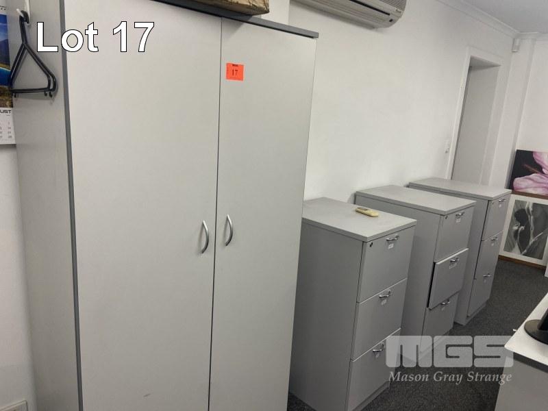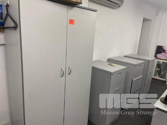 3 x 3 DRAWER FILING CABINETS, GREY MELAMINE, 2 DOOR STOCK CUPBOARD, DESK & OFFICE CHAIR