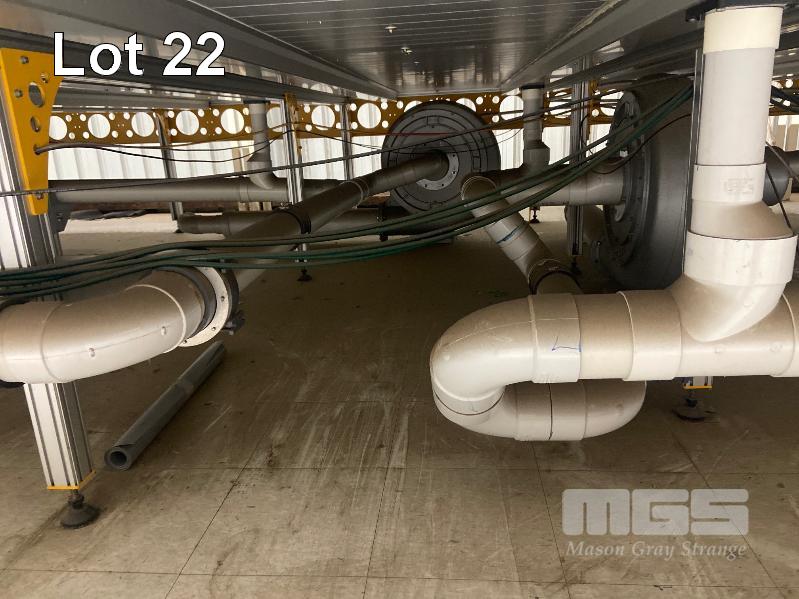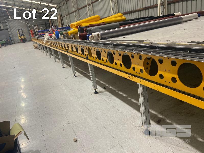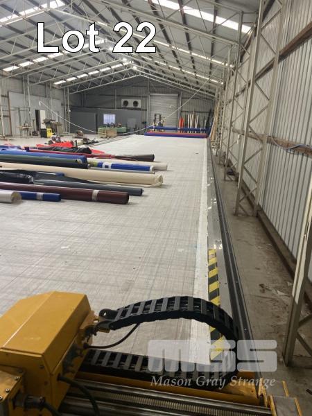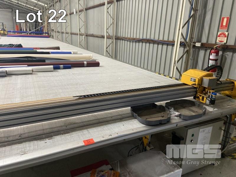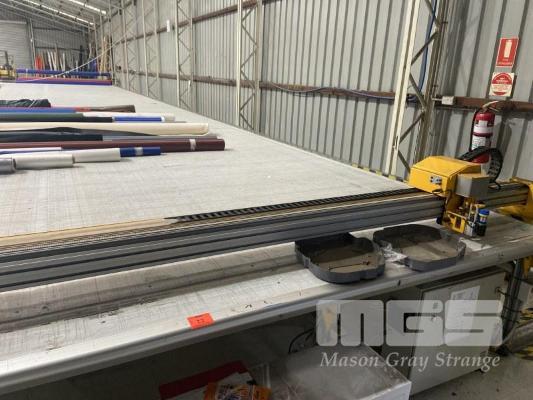 MAXIS MATERIAL VACUMM CUTTING TABLE, PLC CONTROL 17.50 mtrs x 4.140mtrs. VACUUM TABLE WITH AERONAUT PENDANT CONTROL, TRAVEL CUTTING HEAD, APPLE AL IN ONE PC. ON PODIUM, 2400mm SECTION FULLY HEIGHT ADJUSTABLE 2 x PUMPS