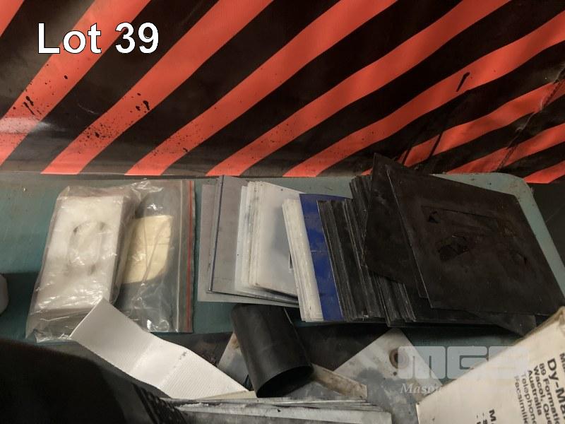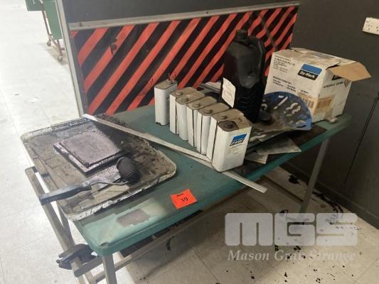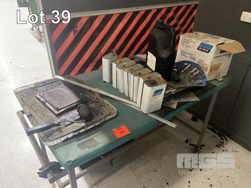 SMALL BENCH, MOBILE WITH MARKING STENCILS, TRAY & INKS AND AEROS CANS.
