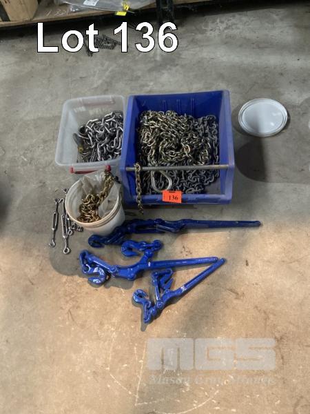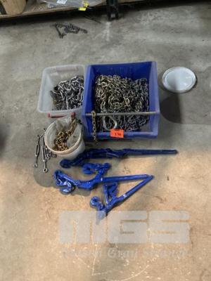 ASSORTED DOGGING CHAINS, 2 x NEW 8mm & HOOKS & 3 x DOGS AND TUB SS CHAIN.