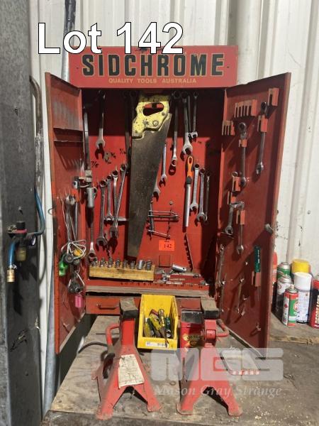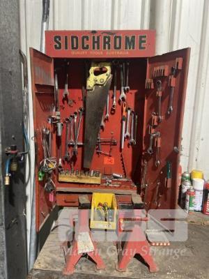 SIDCHROME WALL MOUNT TOOL BOX & CONTENTS SOCKETS, SPANNERS, SCREWDRIVERS & 2 x SAFETY STANDS