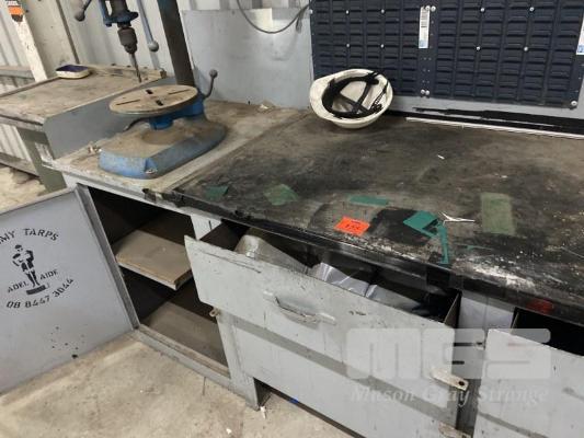 STEEL WORKSHOP BENCH, SINGLE DOOR, 4 DRAWER 2340 (L) x 800 x 940mm WITH BENCH DRILL 240V No2 M/T & WALL MOUNT TOOL BOX