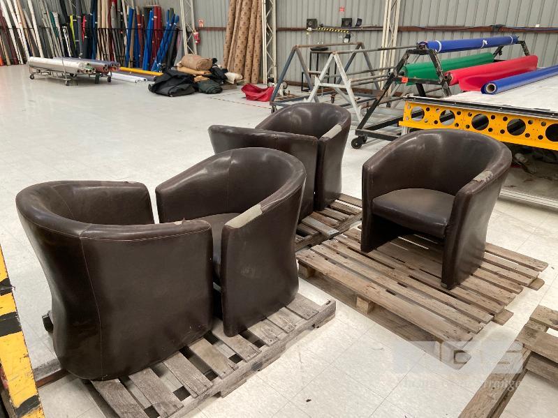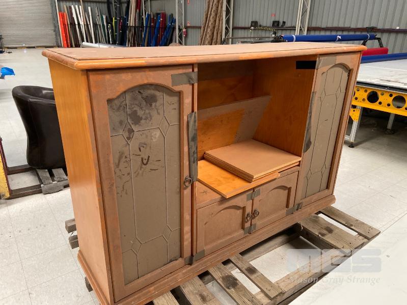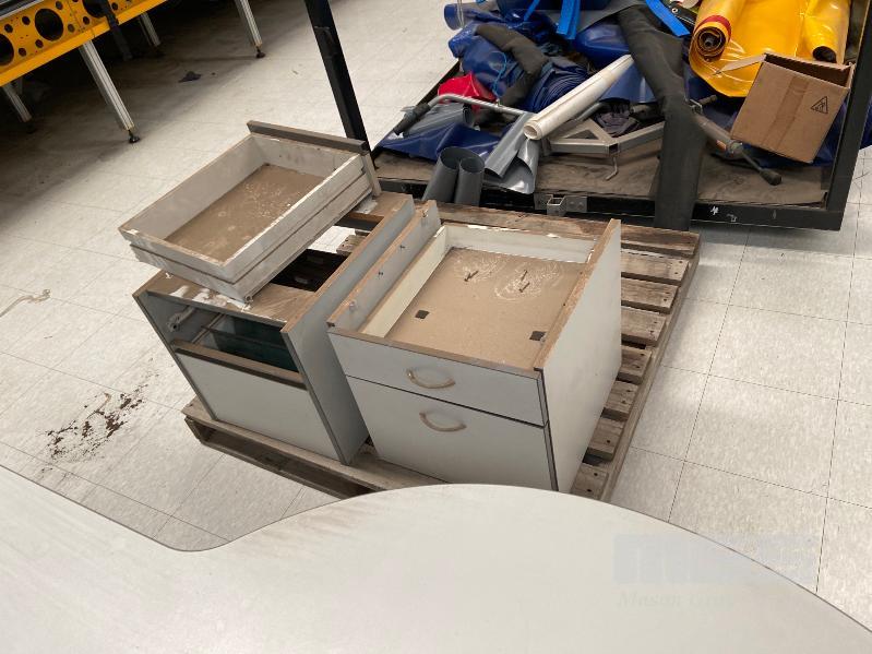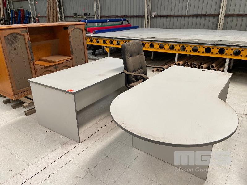 2 x GREY MELAMINE OFFICE DESKS, GAS LIFT, BLACK VINYL CHAIR, TV CABINET & 5 x VISITORS CHAIRS ALL WELL USED