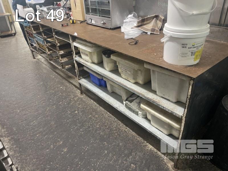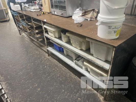 HEAVY DUTY, STEEL TOPPED BENCH, WITH COOLING RACK SLIDER & SHELVES 367 x 77cm