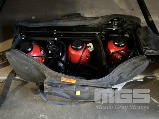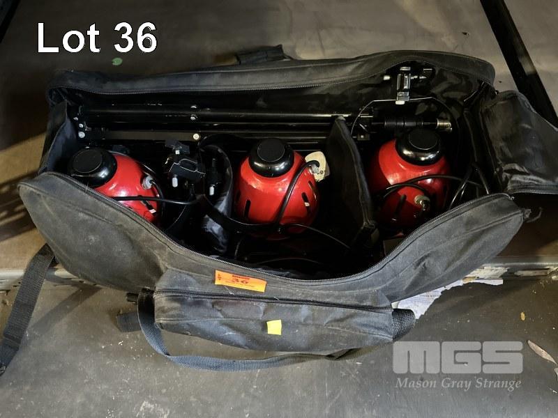 STUDIO LIGHTING SETUP INC. 3 x LIGHTS WITH BARN DOORS, TRIPODS & CARRY BAG